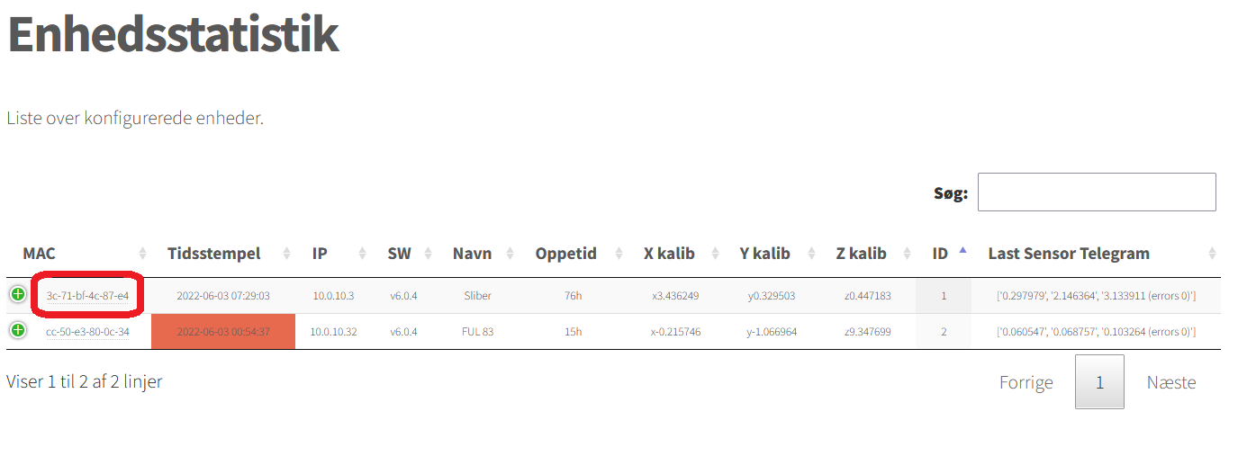 - Hvis boksen er rød på enhedssatistikken, betyder det at der ikke er modtaget data på serveren. Genstart server modtageren, som beskrevet her